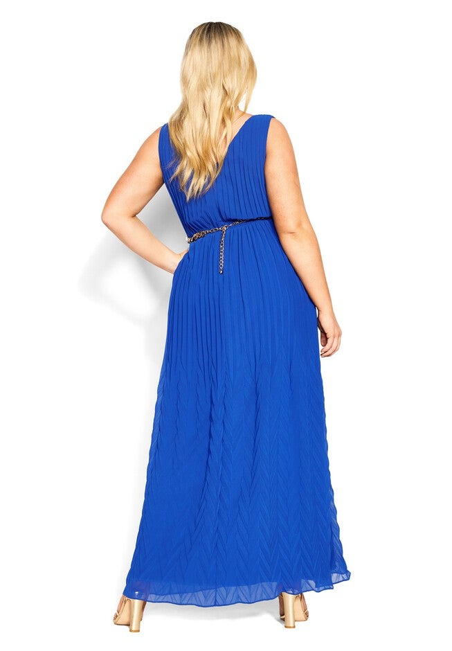 Tailored to fit and flow over your curves, the Eleanor Maxi Dress elegantly bold. This dress features a chain waist belt, all-over pleated overlay and flattering faux wrap V-neckline, perfect for memorable occasions.