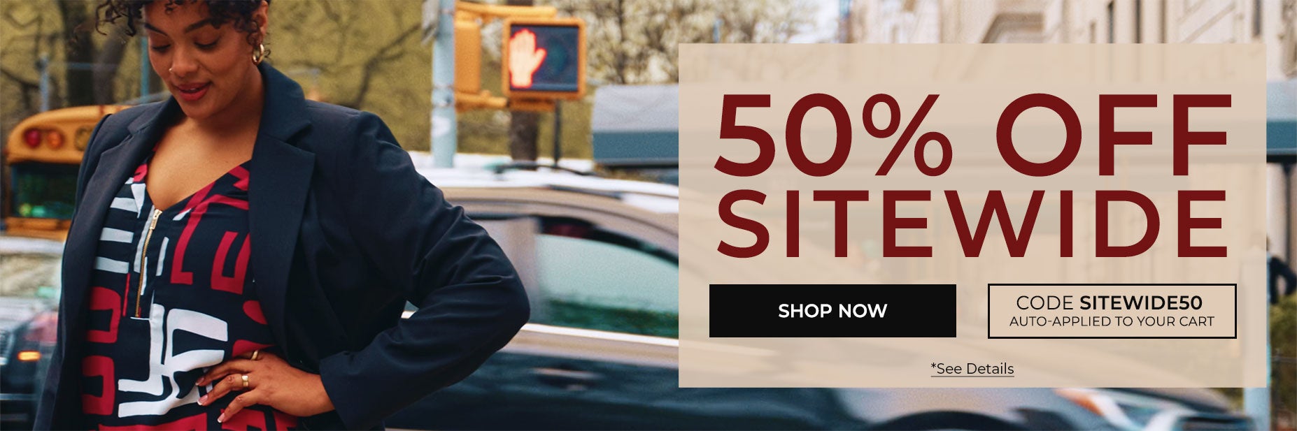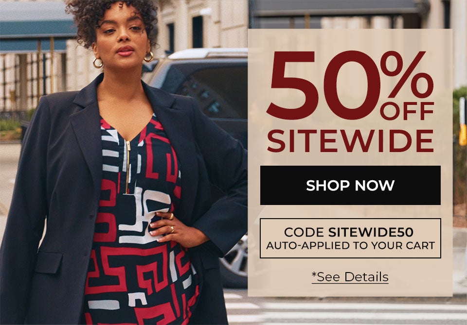 Use code SITEWIDE50 to get 50% off of in stock merchandise of Woman Within, Roamans, Jessica London, Catherines, Avenue, Liz & Me, Ellos, Intimates, Swimwear, Sleepwear and 40% off Shoes. Discount is taken off original prices. Intermediate markdowns may have been taken. Applies to subtotal only. Not applicable to gift cards, prior purchases or when ordering from a catalog. Does not include shipping and handling or taxes. Returns credited at the discounted price. May not be redeemed for cash and cannot be combined with other offers. Valid online only. Does not apply to final sale, menswear, home goods, select swimwear, select accessories, Joe Browns, Jessica’s Style Steals, Eloquii, Catherines Perfect Price Collection, June & Vie One and Only Tees, CUUP, and select third party merchandise. Additional exclusions may apply. Does not apply to International Orders. All items marked as final sale cannot be returned or exchanged. Only applies to in stock merchandise. All promotions and savings are stated in USD. Expires 10/9/2025.