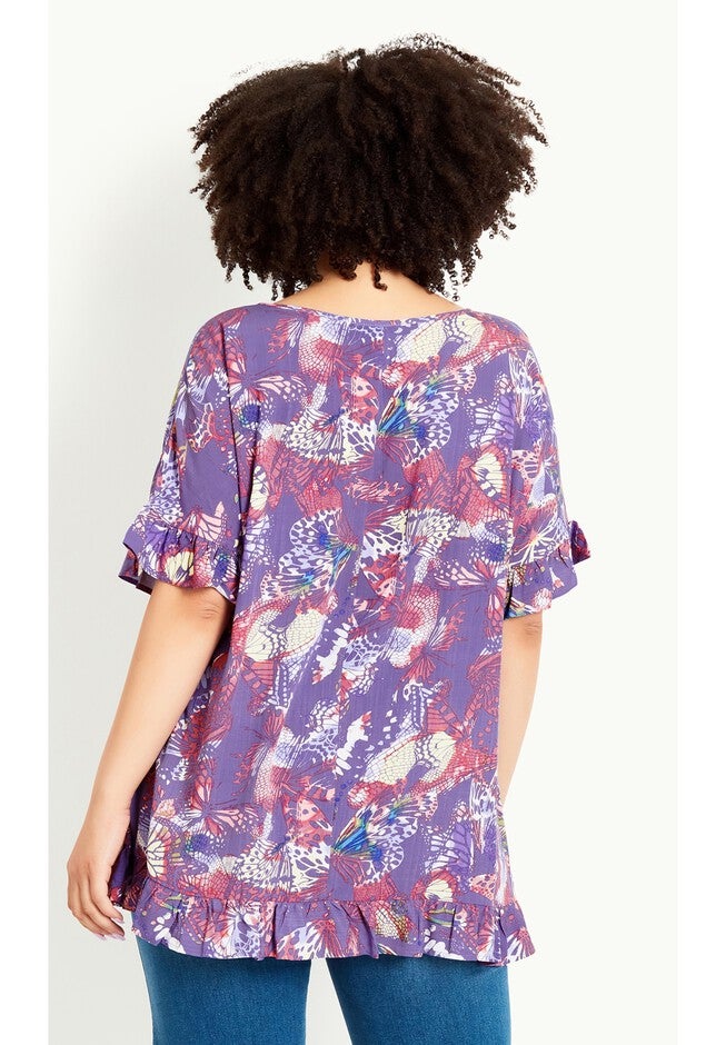 Add a pop of color to your look with the Rivka Frill Print Top. This charming style features a round neckline, relaxed fit and ruffle trim to sleeves and hemline.