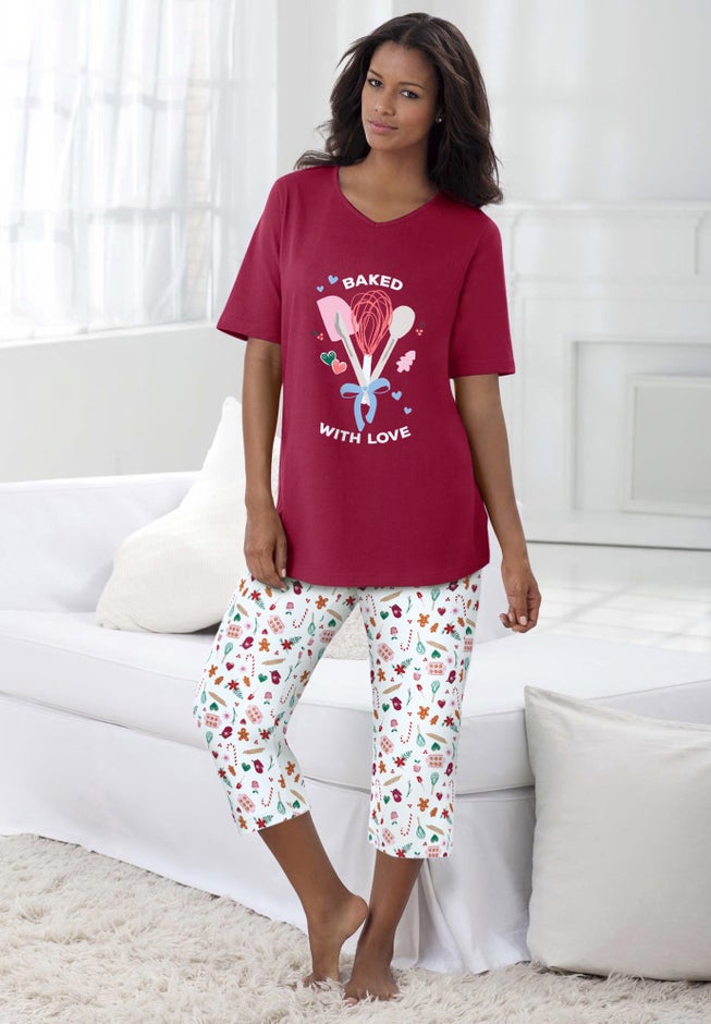 • Includes a graphic tee and matching capri-length pajama bottoms.