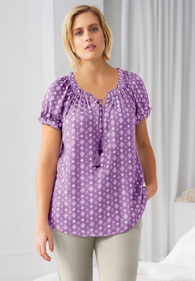 Lightweight, breathable and perfect for sunny days, this women's plus size A-Line Scoop Neck Ruffle Trim 100% Cotton Cambric Peasant Blouse will be your new go-to top. Ruffles at the elasticized short sleeves and a braided tassel tie at the neckline add a feminine touch. This season-spanning style is perfect to pair with jeans or shorts.
