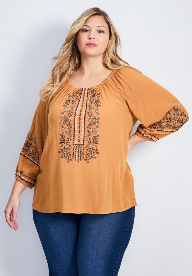 Item Number: 1100826Introducing the Anna Embroidery Detail Top—a piece that's as versatile as it is stylish! Whether you're feeling flirty and want to wear it off the shoulder or prefer a classic look with the elasticated round neckline, this top adapts to your mood. With its 3/4 length sleeves adorned with delicate embroidery and a textured viscose crinkle cheesecloth fabrication, it’s perfect for adding a touch of elegance to any outfit. The intricate placement embroidery down the center front adds just the right amount of flair, making this top a standout choice for any occasion.