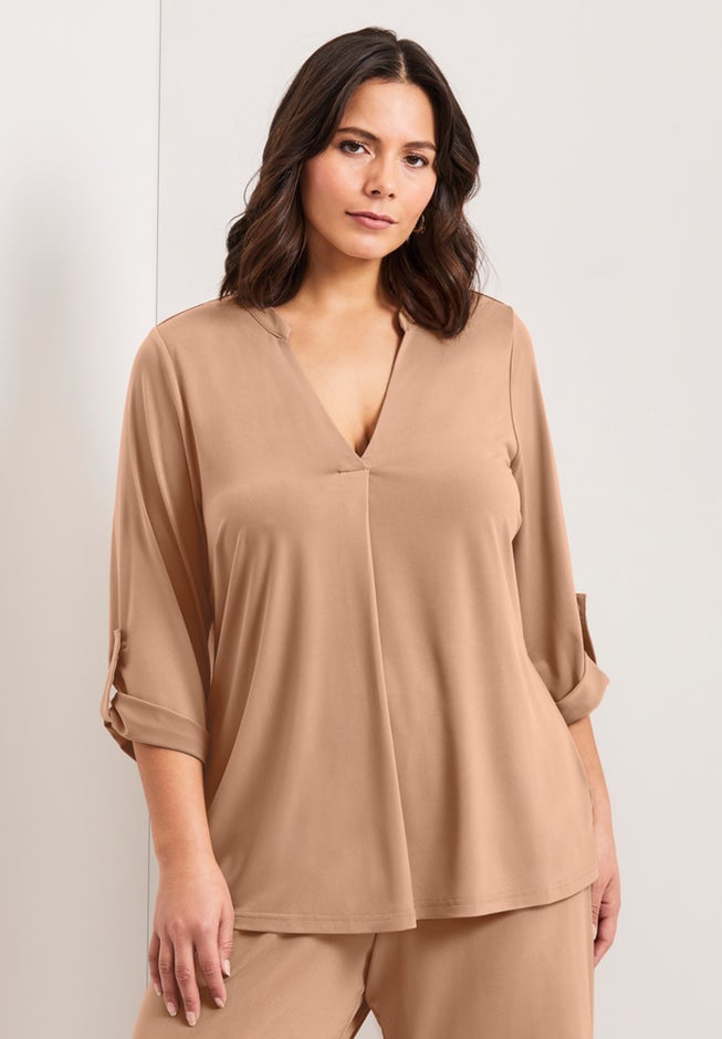 Item Number: 1097000Transform your look from desk to dinner with the Audrey Top! This trendy piece features a flattering V neckline and is made from stretch Jersey ITY fabric for a comfortable yet chic fit. You'll adore the playful 3/4 sleeves with tab and button detail—perfect for adding a touch of style to your outfits. Whether you're headed to a meeting or a night out, the Audrey Top is your fashion-forward companion.