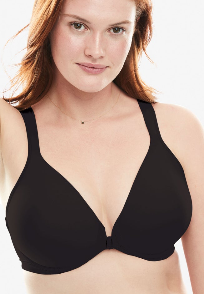 This seamless T-shirt bra shapes comfortably and doesn't show through even the most delicate knit tops. Made with full coverage and a comfortable underwire to lift and support, the wider straps contain light padding that feels great all day long. A racerback style with front closure makes it easy to get on and off.