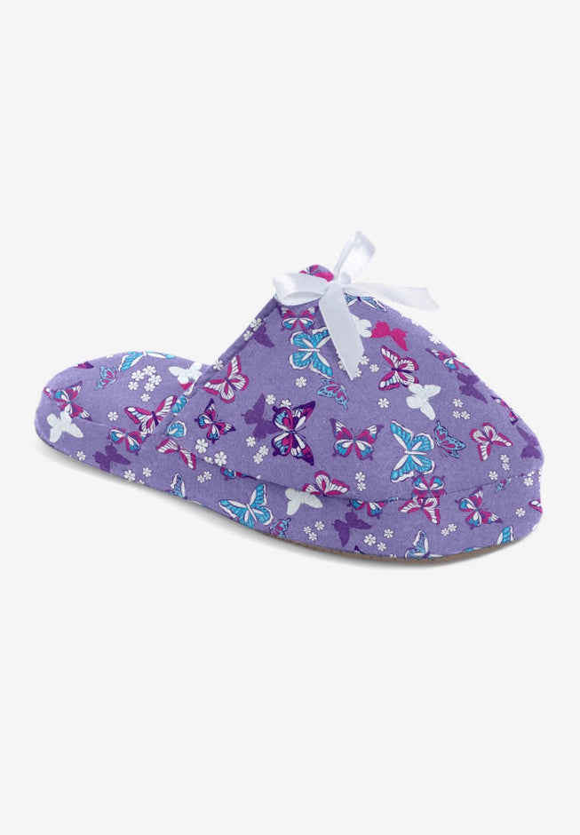 Our ultra-soft cotton slippers surround your feet in total comfort. Beautiful picot trim and satin bow. Flexible, skid-resistant sole for stability.