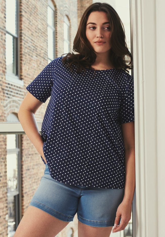 Item Number: 1115224This soft cotton-spandex tee features a classic front silhouette with a modern criss-cross back detail for added interest. Designed with short sleeves and a curved hem, it offers a flattering, easy fit that moves comfortably with you. A versatile everyday essential, it layers effortlessly or stands out on its own with subtle style.