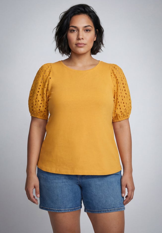 Item Number: 1116753This cotton knit top features statement puff sleeves with delicate eyelet detailing for a feminine, fashion-forward look. Designed with a smooth, breathable body and an easy pull-on fit, it offers comfort you can count on all day. Perfect for elevating everyday outfits, it pairs effortlessly with your favorite denim or trousers.
