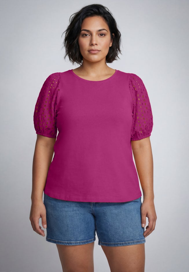 Item Number: 1116753This cotton knit top features statement puff sleeves with delicate eyelet detailing for a feminine, fashion-forward look. Designed with a smooth, breathable body and an easy pull-on fit, it offers comfort you can count on all day. Perfect for elevating everyday outfits, it pairs effortlessly with your favorite denim or trousers.