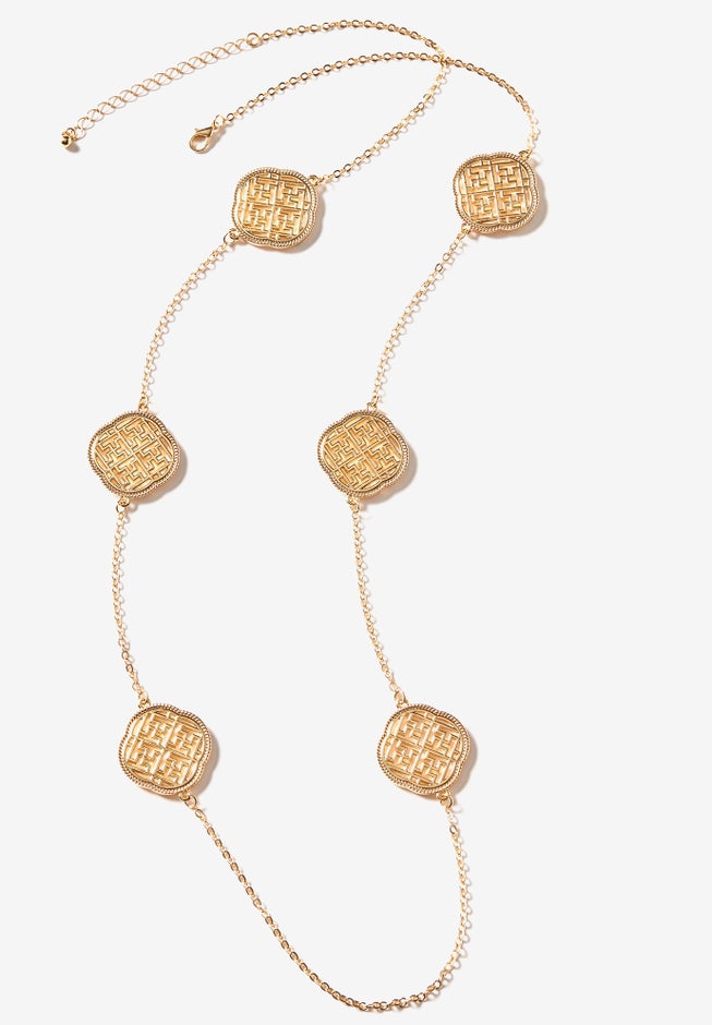 Add instant polish to any outfit with this long-length necklace. Adorned with ornate floral filigree charms throughout. Lobster clasp closure.