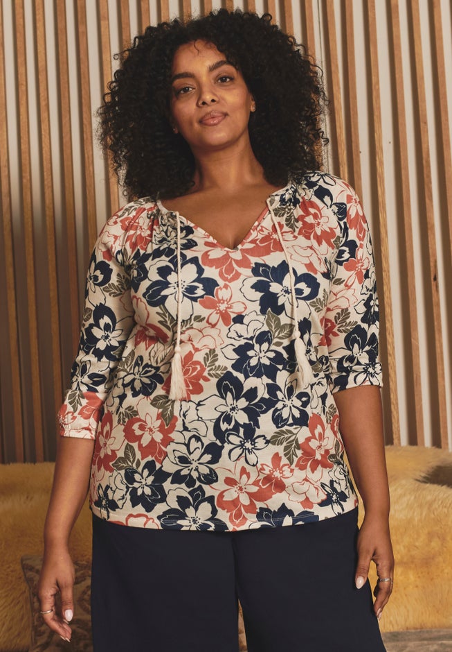 FIT: Relaxed fit. V neckline. 3/4 sleeves with elastic cuffs..