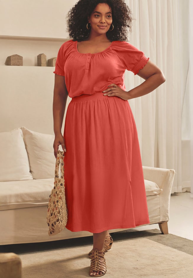 Item Number: 1115210This lightweight crinkle knit gauze skirt features a comfortable smocked waistband for an easy, pull-on fit. Designed with a flowy silhouette and a subtle hi-low hem, it moves effortlessly with every step. Front vent details and side seam pockets add comfort and functionality, making it a versatile choice for everyday wear or warm-weather outings.