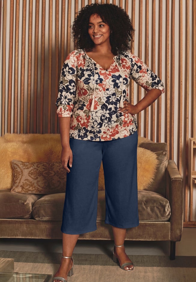 FIT: Pull-on fit. Elastic waist. Wide-leg.