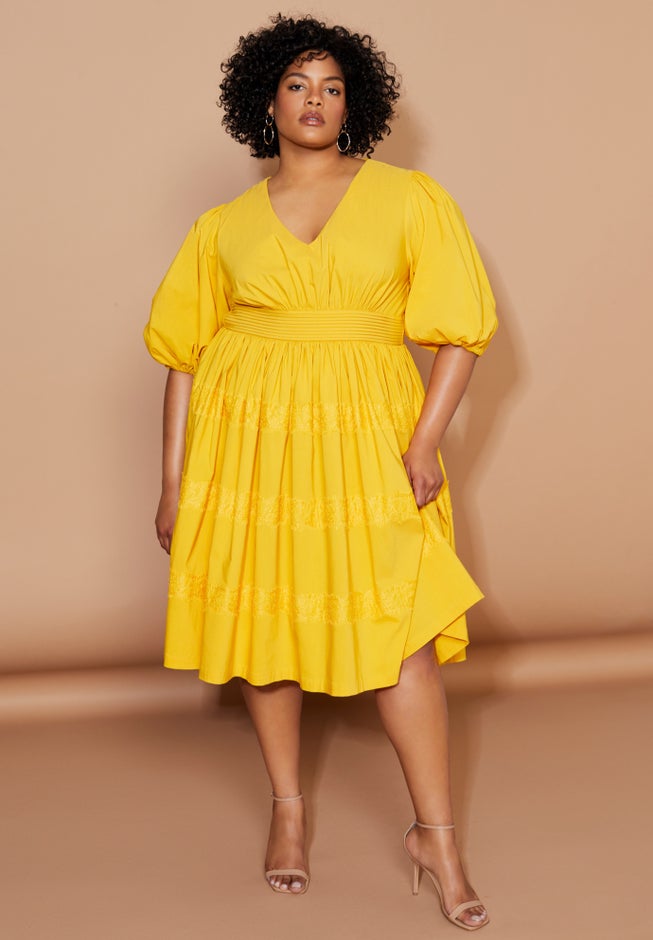 Twirl and swirl into the style spotlight while wearing this voluminous tiered midi dress with delicate lace detail. Featuring a V-neckline and puffed elbow-length sleeves, your new favorite dress includes pretty skirt pleating and a cinching waistband. The full sweep four-tiered skirt comes decorated with lace trim for added detail you'll love.