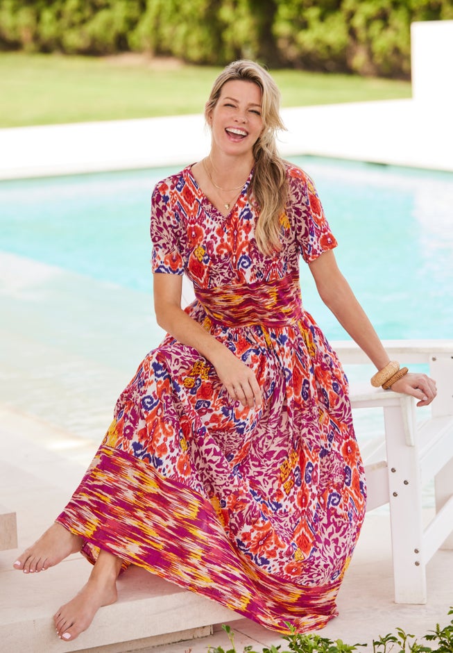 • Crafted from pure crinkled cotton, this lounger offers a relaxed fit and a wide sweep skirt for laidback ease.