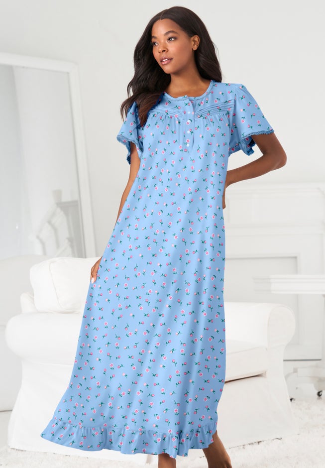 • Enjoy cozy nights and relaxed mornings in this charming long floral print cotton gown.
