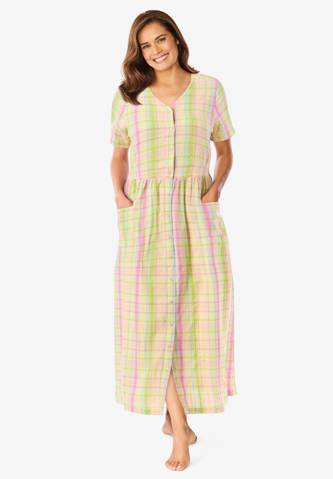 Made in lightweight seersucker fabric for warmer weather, this lounge dress looks great and keeps you cool. A snap-button front and shirred empire waist give the look of a casual dress that makes this perfect for wearing around the house.