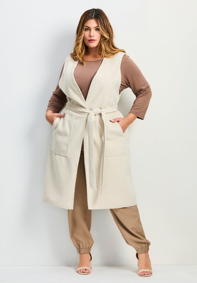 Item Number: 1105630Introducing the Nova Longline Vest—your go-to layer for effortless style! This sleeveless wonder, complete with a self-tie belt and handy pockets, is perfect for adding that extra oomph to any outfit. The brushed fabrication makes it not only chic but also cozy and comfortable. Whether you're dressing it up or keeping it casual, the Nova Vest is sure to become your wardrobe's MVP!