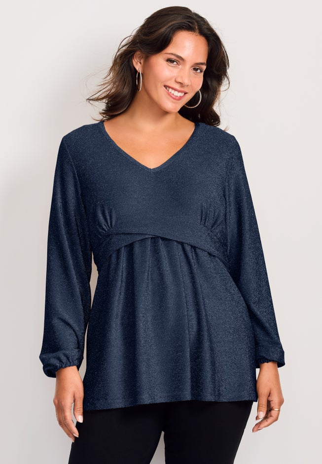 Item Number: 1098131This top features a soft shimmer finish that catches the light for a subtle, eye-catching glow. It has a V-neckline and a gathered empire waist seam that provides a flattering, feminine silhouette. The long sleeves are finished with elastic cuffs, adding a touch of volume and ease to the overall look.