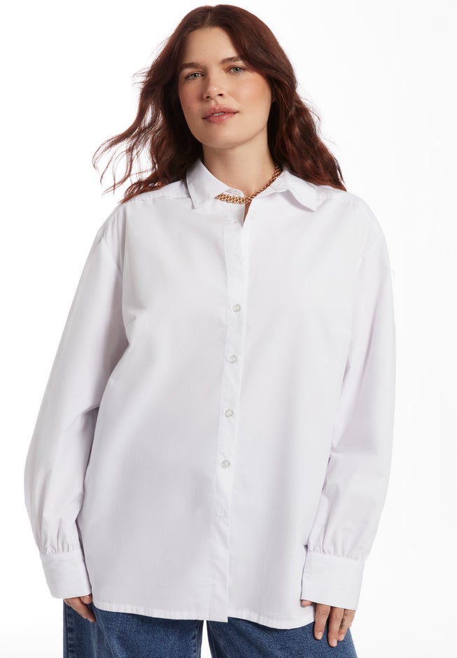 An everyday silhouette with a quietly confident, yet unmistakably feminine spirit. From its shirred sleeves to its softly elongated form, this button-front poplin blouse brings a certain je-ne-sais-quoi to your capsule wardrobe. Wear it layered under chunky knits or let it stand alone—it carries charm either way.