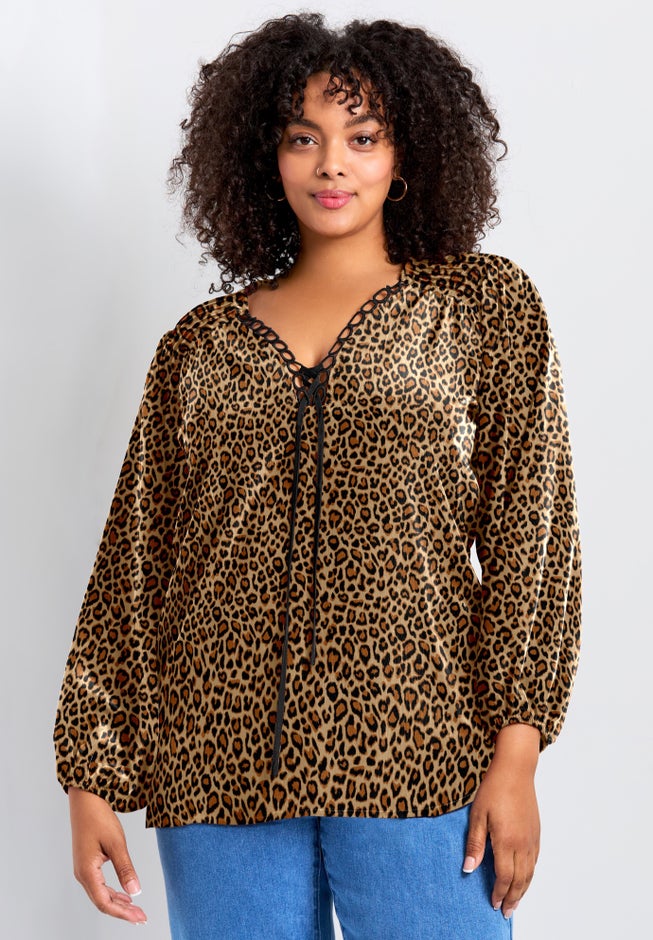 Item Number: 1097655This blouse features a gathered shoulder detail and a relaxed fit with voluminous long sleeves for a romantic silhouette. The V-neckline is accented with delicate trim and a front tie, adding a stylish and feminine finish.