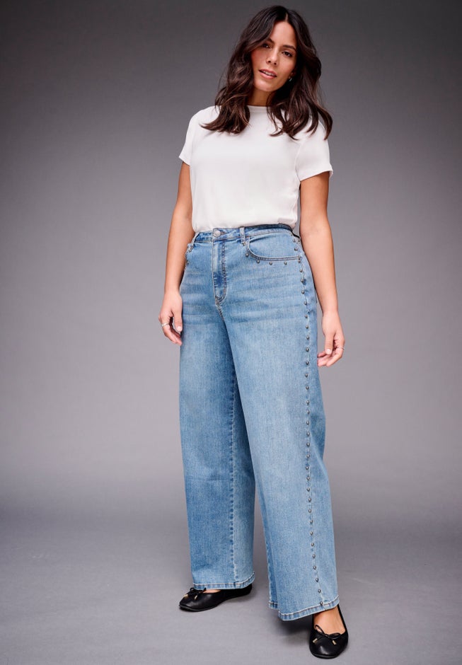 Item Number: 1113318A modern take on a classic silhouette, these wide-leg jeans feature subtle stud trim along the seams for a touch of edge. The high-rise fit flatters the waist while the relaxed leg creates effortless movement. Perfect for elevating everyday style with understated detail.