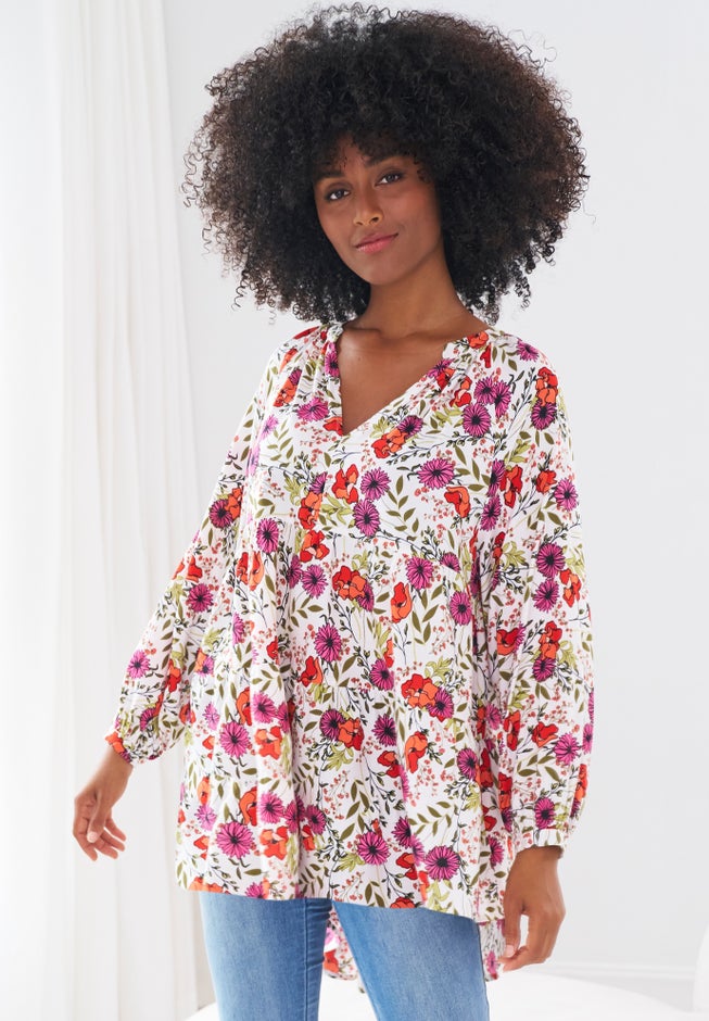 This two-tier, A-line tunic adds a light, femme look to your fall wardrobe. Blouson sleeves feature stretch cuffs you can push up when you’re feeling casual.