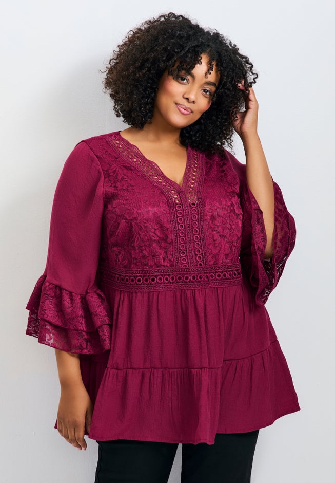 Item Number: 1097023Introducing the Wallflower Tunic—your new wardrobe essential that marries elegance with comfort! With its intricately designed lace bodice and charming lace ruffle sleeves, this tunic is all about making a statement. Each tier flows gracefully, creating a silhouette that's flattering and fabulous. Lined for your comfort, it's perfect for any occasion where you want to feel effortlessly chic and utterly confident. Say hello to your new favorite fashion piece!